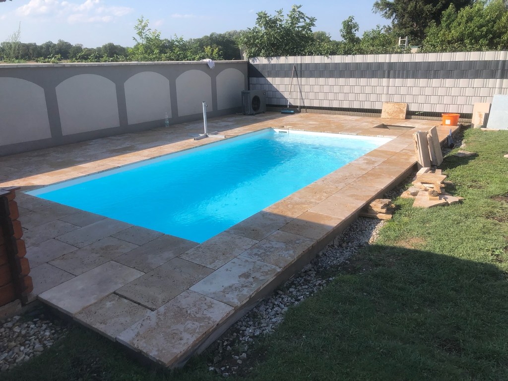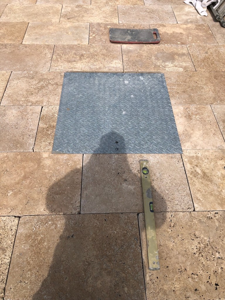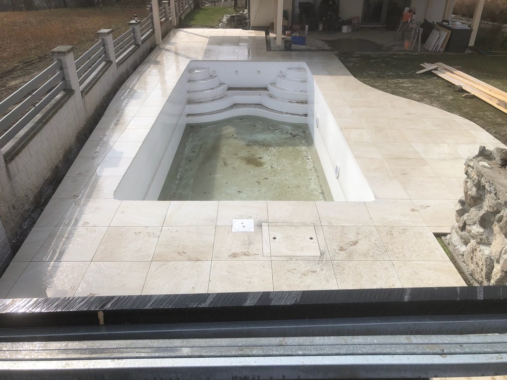 StufenPoolumrandung: Fliesen 60 cm x 60 cmPoolumrandung: Fliesen 60 cm x 60 cmPoolumrandung: Travertin 60 cm x 40 cnPoolumrandung: Travertin 60 cm x 40 cnPoolumrandung: Travertin Pumpenschacht (vorher)Poolumrandung: Travertin Pumpenschacht (nachher)Bestehenden Belag neu verlegen.Duschplatz